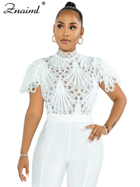 Short Sleeve Hollow Out Mesh Lace T-shirt Sheer See Through Crop Top